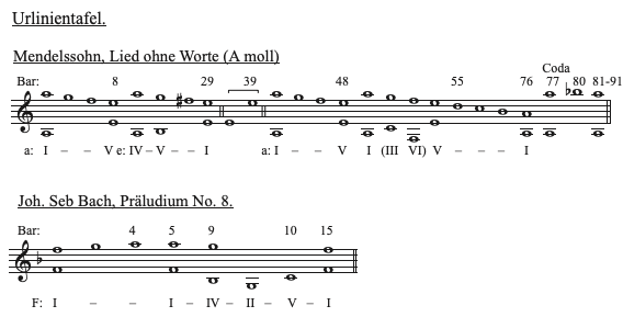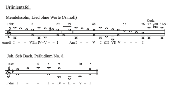 Since I am currently again very busy studying your works, I am apprehensive as to whether I am really understanding it all correctly. For this reason I hatched a plan to send you two independently undertaken analyses, respectfully requesting you to look them over when you have a moment – a request that, since I have already been the beneficiary of your kindness, I feel sure you will not refuse me. The two examples are: Mendelssohn, Song without Words in A minor, {2} Peters edition (unfortunately) No. 2, and No. 8 of the Twelve Short Preludes by J. S. Bach. I have presented just the Urlinie and scale-degree progression. 2