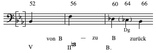 progression by steps of a second here is as follows: Thus finally he is able at m. 44 to embark on the downward motion and set up the cadence: in m. 45 the first approach to the dominant is via ę II; in mm. 46, 47 the second approach is via IV–V; after these two approaches, the third is more intricate, and already leads to the close. In mm. 48–49 the structural harmonies Aę – Eę – Bę – F (note how the exit-point occurs a third higher: Dę in m. 44, F in m. 46, Aę in m. 48, these points, in themselves ⇧ understood chromatically, already resulting in the ę III). Now in mm. 50–53 ę II is expansively presented. In mm. 54–61 the cadential motive itself [emerges]. It sounds like an extension of the motive from mm. 17ff (except that the fourth there [becomes] the fifth here). In m. 55 I, in m. 56 IV, in m. 57 VII, in m. 58 passing harmonies to V in m. 59 (cf. the same structural harmonic progression in mm. 17–20), via two chromatic alterations, which point to the neighbor-note harmony of IV [m. 59, beat 2], to IV in m. 60 and the dominant in m. 61, in m. 62 the tonic as the close. The neighbor-note harmony of ę II is overlaid on the tonic; the motive is the fourth-motive from m. 21. It is interesting that this very cadential formation is initially dispensed in three blows, whereas it is extended by immediate repetition to four blows. 17 This happens by virtue of the participation of the viola, which beneath the harmony of [ ę ]II plays a root a third lower: BĚ. 18 The tonic has the major third, cf vol. I. 19
