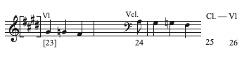 T. 72+73 sind im Grunde so zu sehen: [left blank] T. 74 Oktaven zwischen Sopran u. Baß, nicht nur wegen der Stufen, sondern auch wegen des dazwischentretenden Quartschrittes gut. T. 77 Dominante schließt die 8-taktige Tonreihe, so daß die nachfolgende Wiederholung zunächst als Nachsatz gehört wird. T. 78ff Variation der Melodie bei der Violine, wieder zur Dominante in T. 85. Man beachte die Verschiedenheit der Baßführung in T. 78–81 gegenüber der die T. 70–73. T. 86 Triolen-Begleitung Vl. u. Br.; Vcl. figurirt die Tonreihe des T. 70, worauf das Klavier im Thema fortfährt. T. 88 Beim Vcl. Verschleierung des Sachverhaltes durch Wiederholung des Motivs aus T. 86; man neigt infolgedessen in T. 86 die Bedeutung der Figur zu verkennen. Gerade eine solche Versch[l]eierung aber ist ech[t] symphonisch! {3} In T. 91 wieder Halbschluß, zum 3. male. T. 94 Wiederholung der T. 86ff, ebenso wie früher T. 77ff Wiederholung der T. 70ff gewesen. Mischung Esm. T. 100 Nicht mehr zur Dominante geht es, sondern eine kräftige Kadenz führt zur letzten 5. Wiederholung des Themas, die mit g, also eine Terz höher beginnt. T. 122 Beginn der Durchführung, 1. Motiv im Portamento; aber dieses Portamento erweist sich als der Uebergang vom legato zum staccatto im T. 142. T. 130 deutlich Esm. T. 138 vgl. T. 50 T. 142ff Plan: 5 Einem geschlossenen Bildchen in Hd, T. 142–151, bezw. 152 tritt eine modulatorisch suchende Partie von T. 154–163 gegenüber; nun wieder, aber in Gd, ein geschlossenes Bildchen, T. 164–174, dem wieder suchend u. modulierend eine Partie von T. 176 bis Ende der Durchführung gegenüber tritt; vgl. IX. Sinf. 6 T. 152–153 Ueberleitung vom geschlossenen Bild zum Gegenbild. T. 154 Beim jeweilig 3. Viertel Vorausnahme der Harmonie des jeweilig nachfolgenden 1. Viertels nach Art einer Synkope. In T. 156–159 beachte man als Grundtöne, (nicht als Stufen!) die Terz-Schritte d – b – dis – h. T. 161 Hemiolenartige Verdichtung; Harmonie: [music example probably intended but not entered] T. 176 Nach der Durchführung des Motivs des 1. Themas folgt hier eine des 2. Themas auf dem Orgelpunkt G u. kanonisch ausgeführt; die imitirende Stimme setzt zuerst im Abstand von 3 Vierteln, also eines ganzen Taktes ein, siehe T. 177–178, in T. 185 setzt, sie bereits nach 2 Vierteln ein, während sie endlich in T. 191 bereits nach einem Viertel einsetzt; hier tritt noch eine {4} 2. Stimme, siehe Klavier, imitierend ein. Harmonien!